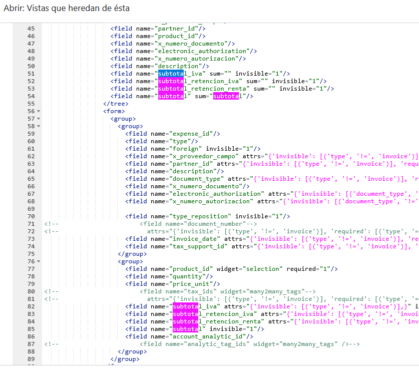 Si no aparecen esos campos hay que editar desde el vista:form ya que no están en código, el campo se llama " x_numero_documento" y si quiere que aparezca la suma del subtotal establecer el valor sum en el campo subtotal (sum="subtotal")